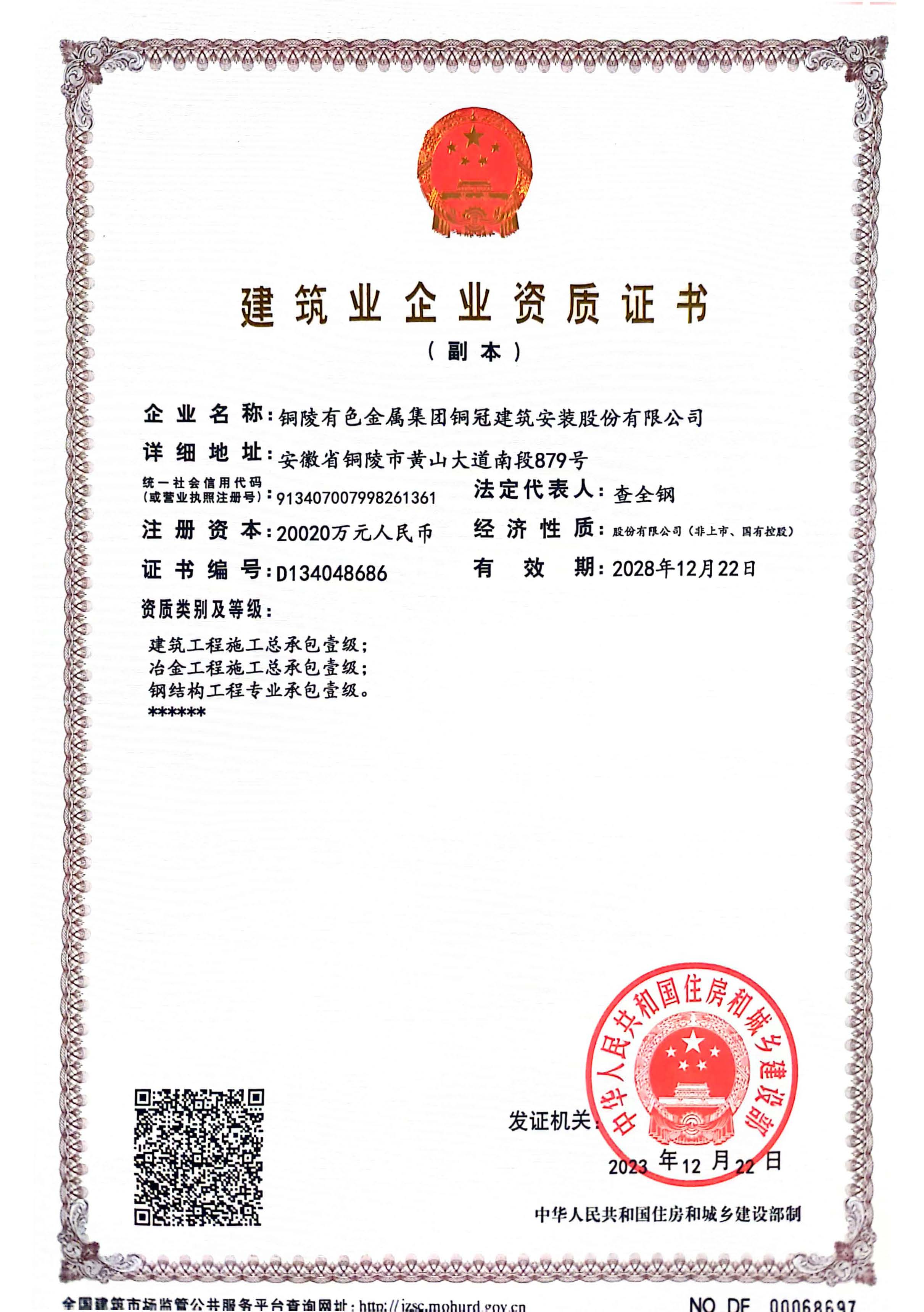有色金属工业建设工程质量检测机构资质证书